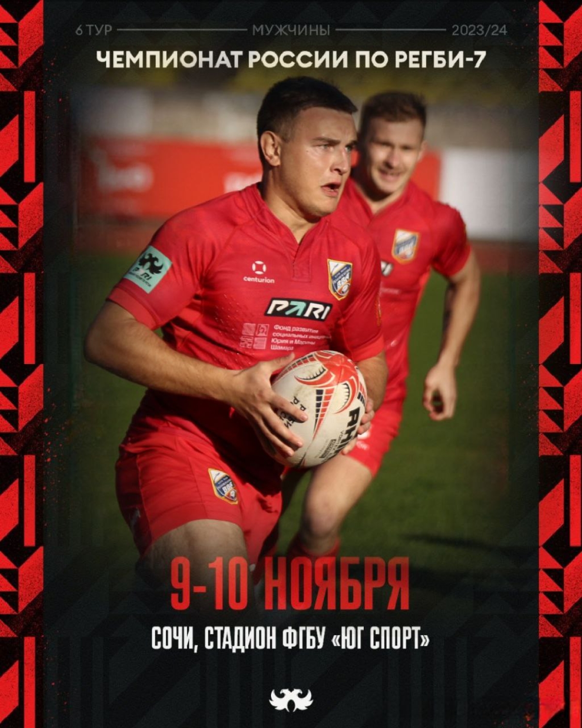 9 и 10 ноября в г. Сочи на стадионе ФГБУ «Юг Спорт» состоится заключительный, 6 тур Чемпионата России по регби-7 среди мужских команд. В субботу команда «ВВА-Подмосковье» стартует в группе С. В первый игровой день «военлёты» встретятся с тремя соперниками: 11:00 & «Локомотив» 13:10 & «Енисей-СТМ» 16:00 & «Таганий Рог» Следите за расписанием игр плей-офф и трансляциями на нашем телеграмм-канале «Регби-клуб «ВВА-Подмосковье» https://t.me/VVARugby