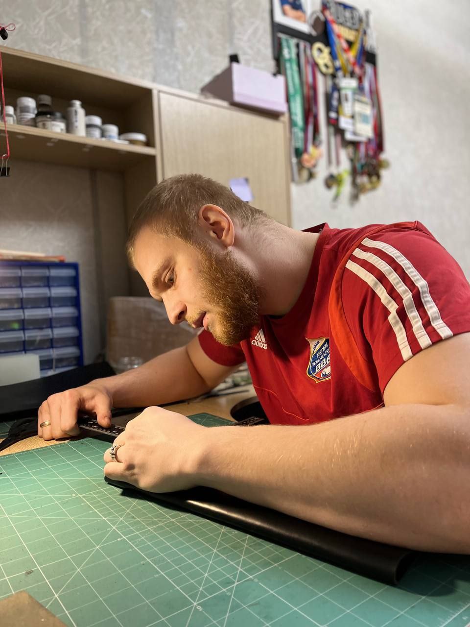 - В одной из ваших социальных сетей мы обнаружили необычное хобби. Расскажите об этом? С чего все началось? - Да, помимо регби, я решил развиваться в чем-то ещё, и выбрал для этого кожевенное ремесло. Началось все с того, что летом я восстанавливался от травмы и не мог в полной мере тренироваться. Появилось свободное время и его чем-то нужно было занять. Решил попробовать купить некоторые инструменты для этого и кожу. Первое моё изделие это была обложка для паспорта (вся кривая, косая, несуразная), которую утащила моя любимая жена и не хочет с ней расставаться. В дальнейшем были изделия уже сложнее и все кому я их показывал говорили: "Очень круто получается", также подбадривали не останавливаться и не забрасывать это дело. Сейчас уже делаю изделия на заказ и просто кайфую от этого.